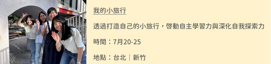 從一堂課開始,打開對自己的不同理解 透過設計好的活動與引導,讓學生在短時間內體驗自我探索與學習的可能性 我們的課程與營隊 : 我們為學校與教育單位設計各類主題課程與營隊,將「自我覺察、自主學習、未來探索」轉化為可被體驗的學習歷程。